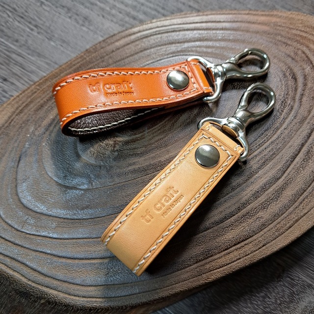 ご覧頂きありがとうございます。 [商品説明] 栃木サドルレザーをメインに使用したキーホルダーになります。 裏地にはゴートレザーを使用し、上品に仕上げてあります。 表面の質感はややつるつるしており、若干の撥水性があります。 硬めで丈夫な革ですので、長くお使い頂けるかと思います。 [仕様] 本体カラー:オレンジ 本体材質 :栃木サドルレザー(タンニン鞣し革) 裏地カラー:ダークブラウン 裏地材質 :ゴートレザー(タンニン鞣し革) 縫製糸 :ビニモMBT(総手縫い) パーツ :リング/ナスカン/ホック Size(本体) W:24mm D:12mm H:80mm (金具含む: 112mm) Size(本体 開いた時) W:24mm D:2.5mm(一番厚いところ: 10mm) H:160mm(金具含む: 205mm) ※製品サイズにつきましては、多少の誤差がございますのでご了承下さい。 ■返品・交換について 商品の品質につきましては万全を期しておりますが万一、不良・破損などがございましたら、商品ご到着後7日以内にCONTACTページよりご連絡下さい。 返品または交換の対応をさせて頂きます。 詳しくは、SHOPPING GUIDEページをご参照下さい。 ■革製品のお取り扱いについて 革製品は大変デリケートな性質を持ちますので、SHOPPING GUIDEページに記載の注意事項をご参照頂きご理解の上、ご使用頂けますようお願い申し上げます。