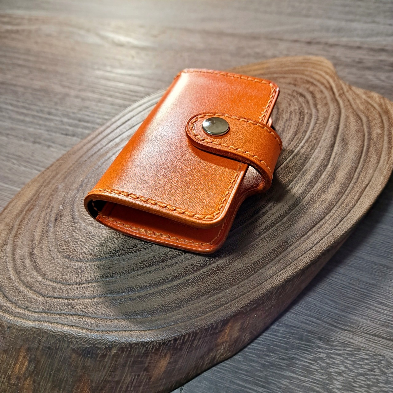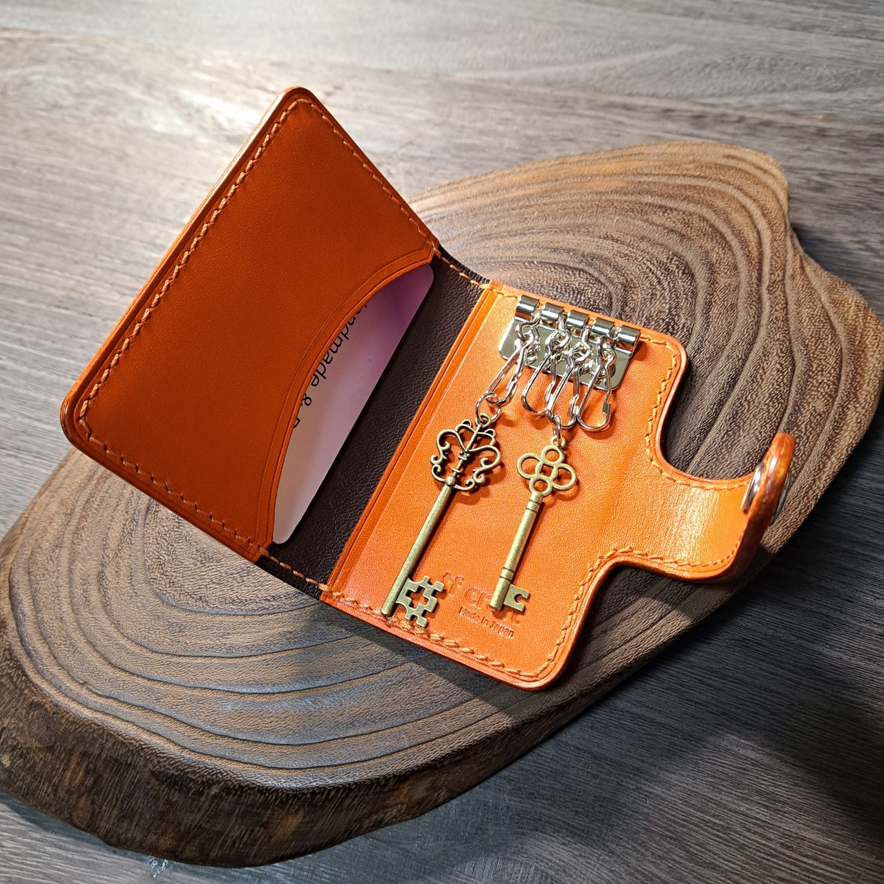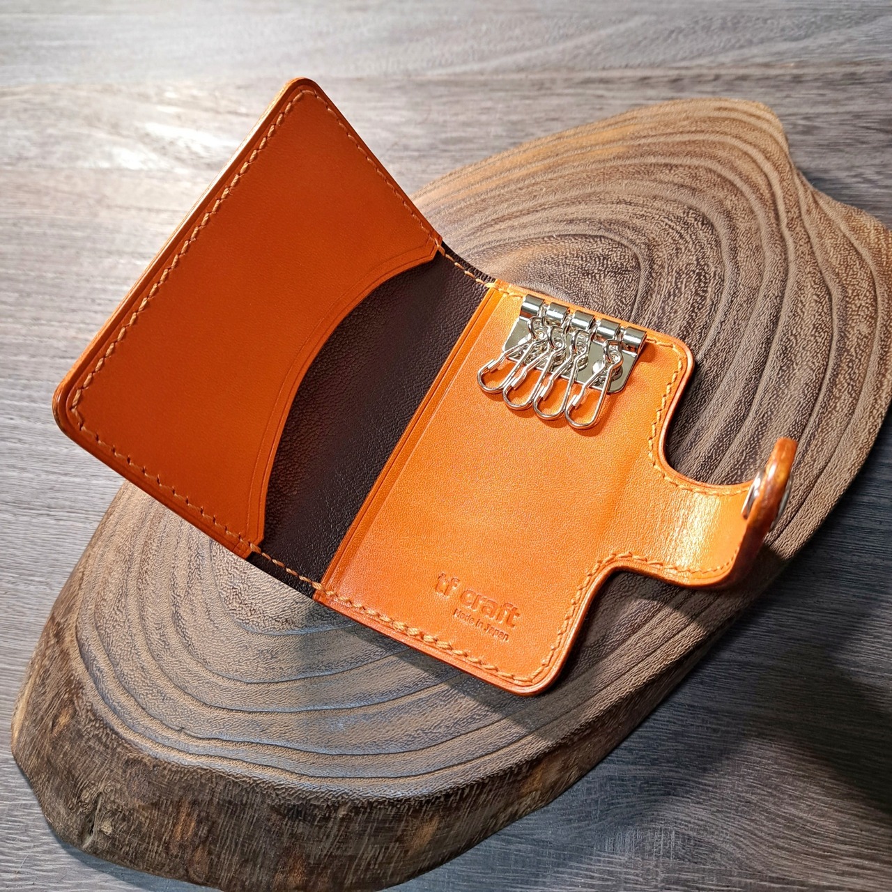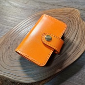 鮮やかなオレンジ色の栃木レザーをメインに使用した、二つ折りデザインのキーケースになります。
