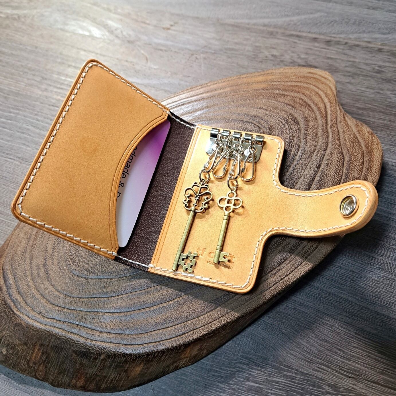 イタリアンレザーをメインに使用した、二つ折りデザインのキーケースになります。