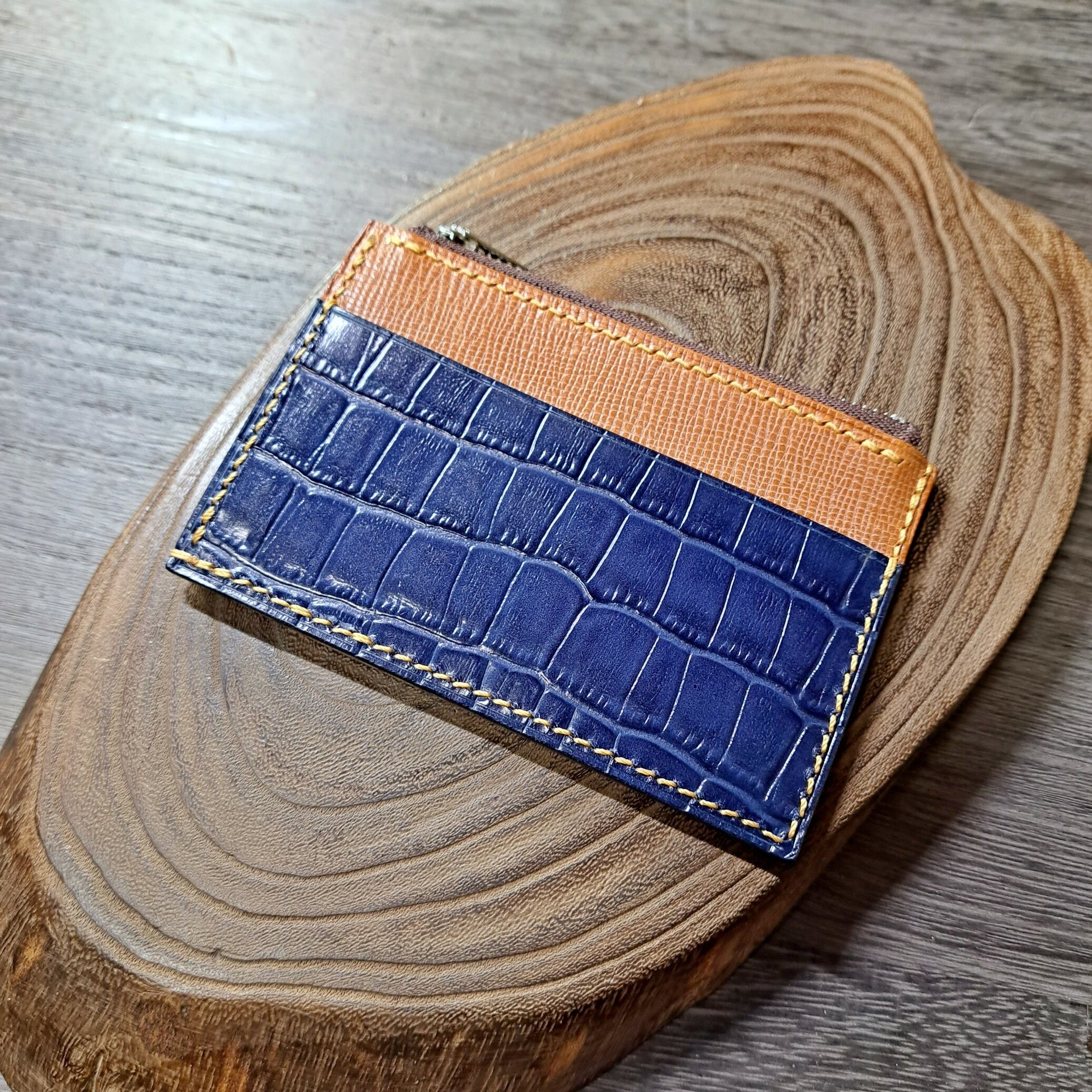 アクセントとしてポケットの一部にネイビーカラーのクロコダイル柄の牛革をあしらっています。